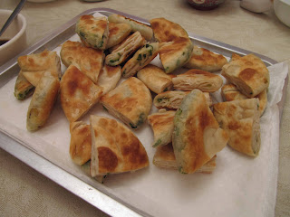 We'd usually intentionally make more dough than warranted to make dumplings to make green onion pancakes. Though flat like pancakes, perhaps these are better classified as biscuits rather than pancakes in terms of their consistency. These are easy to make by sprinkling chopped green onions on a relatively small circular flat piece of dough and folding and flattening this dough again and again. The result is a chewy multi-layered pan-fried biscuit with the sweetness of the green onions scattered within it. Salt is added into the dough mixture rather than sprinkled with the onions to ensure a more even and consistent saltiness in all the green onion pancakes.